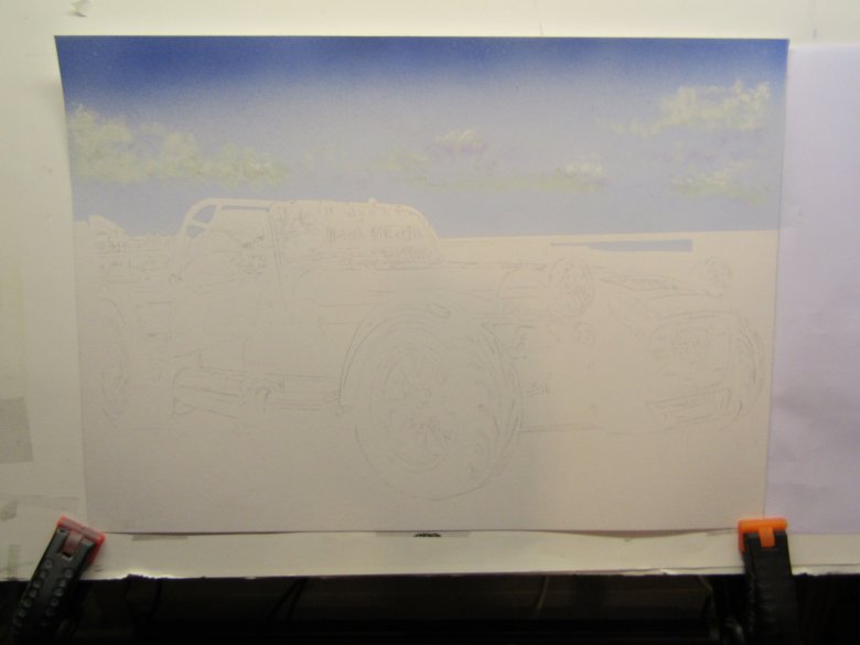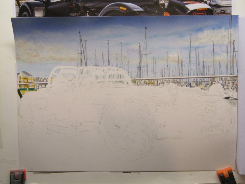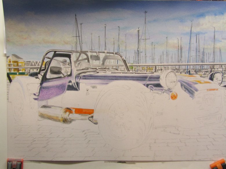 stage one, sketched details of caterham, airbrushed the sky addded cloud features, 220gsm cartridge paper,